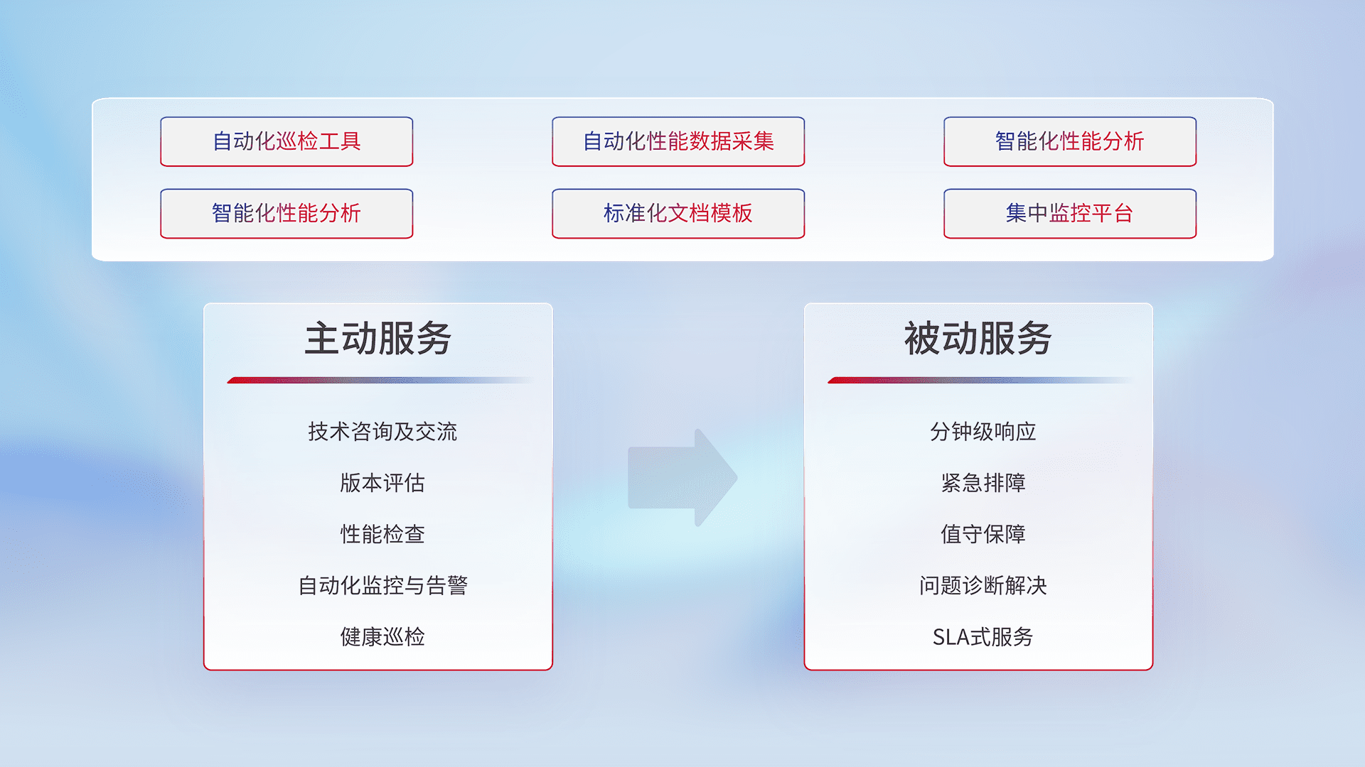 智能化工具和标准化文档,,保障服务质量,,,提供主动服务(包含技术咨询、、、、版本评估、、性能检查、、自动化监控与告警、、、健康巡检)和被动服务包含(分钟级响应、、、、紧急排障、、、、值守保障、、、、问题诊断解决、、、、SLA服务)。。。